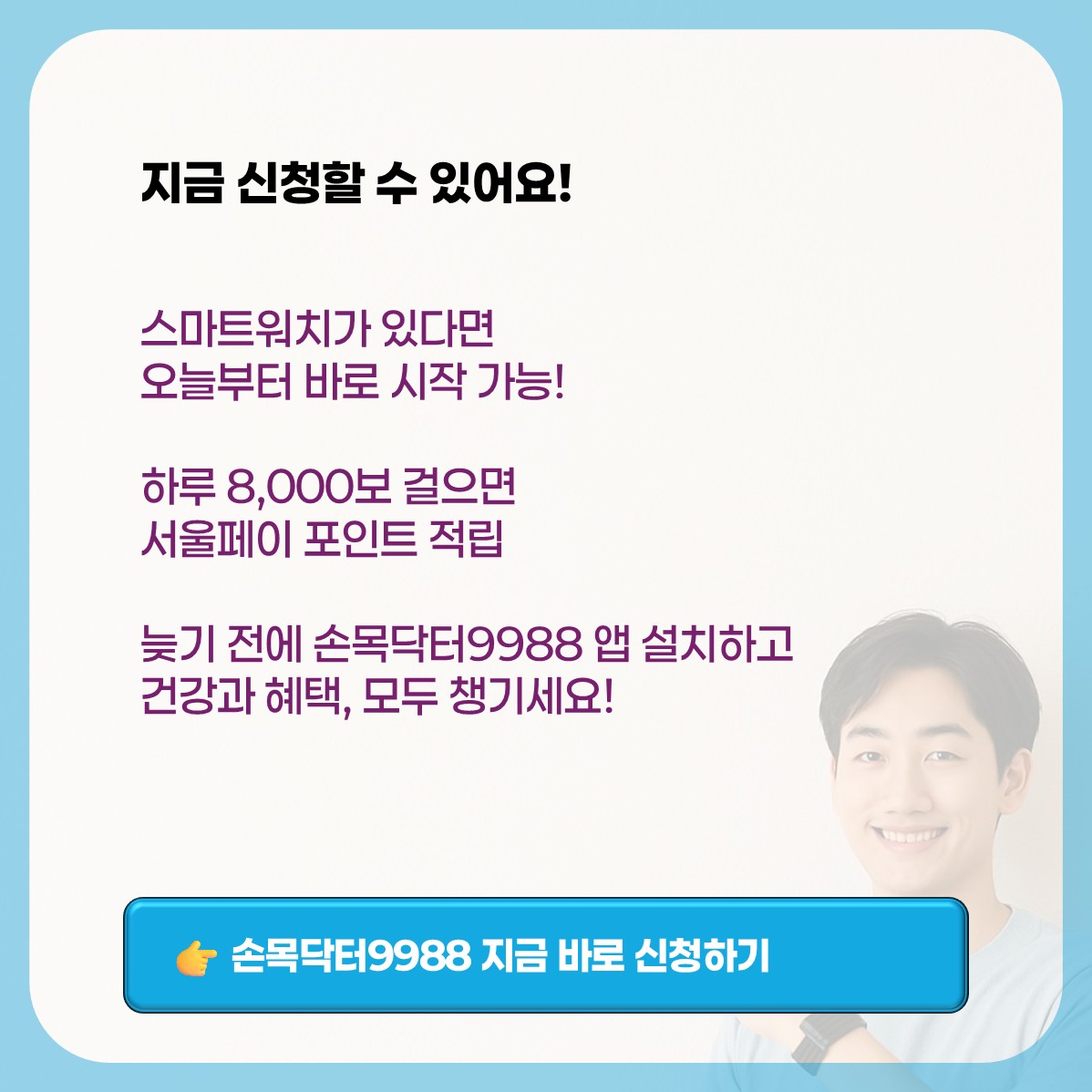 서울시가 주관하는 비대면 건강관리 프로그램 ‘손목닥터9988’이 화제를 모으고 있다. 특히 신청자 중 다수가 “스마트워치가 꼭 있어야 참여할 수 있다”는 조건에 대해 궁금해하고 있다. 오늘은 그 핵심, 스마트워치 연동 조건과 주의사항에 대해 총정리한다.
