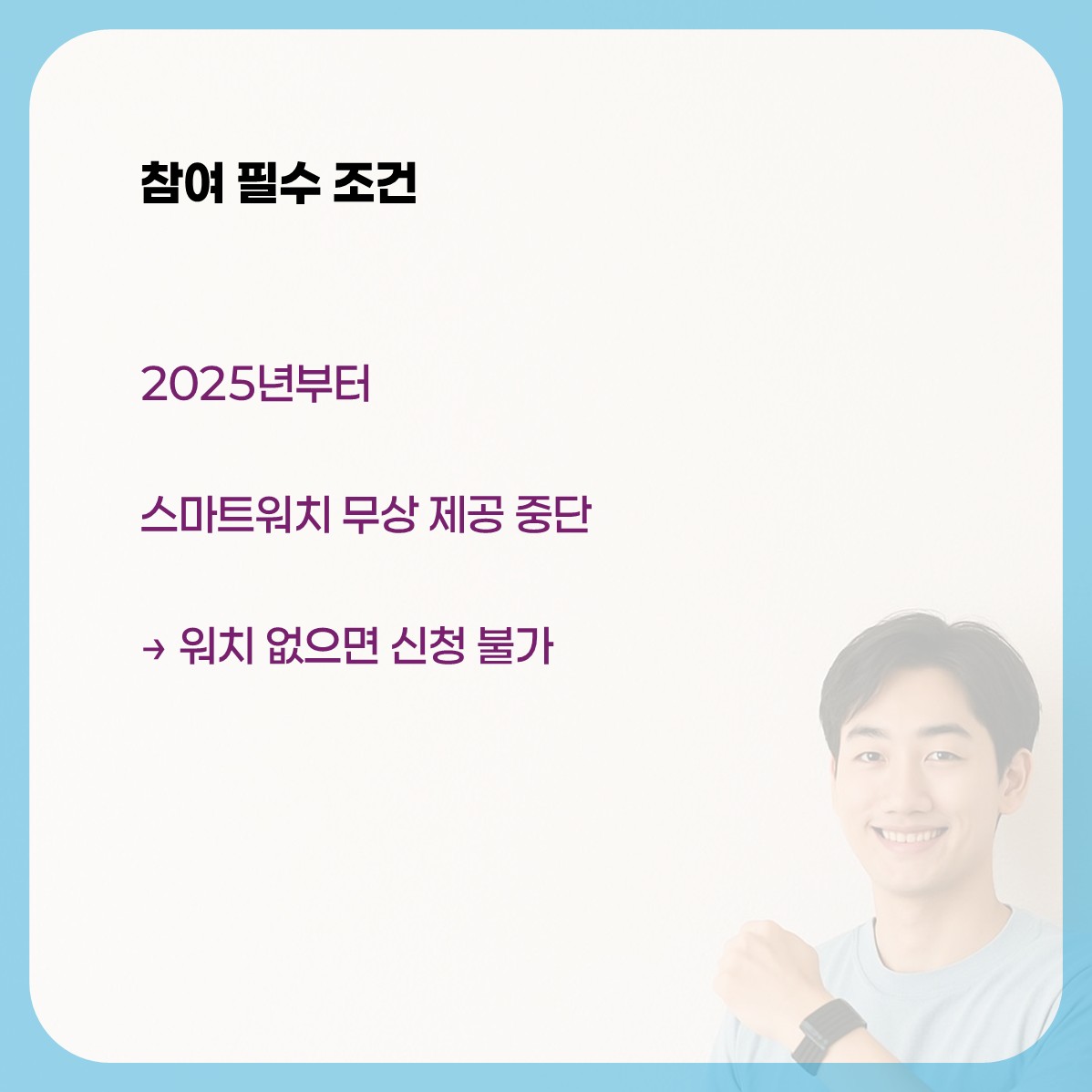 손목닥터9988은 스마트워치를 활용한 자가 건강관리 프로그램이다. 그러나 2025년 하반기부터는 스마트워치 무상 제공이 종료되면서, 신청 시 워치 소지 여부가 필수 조건이 되었다. 다시 말해, 워치가 없다면 신청 자체가 불가하다.